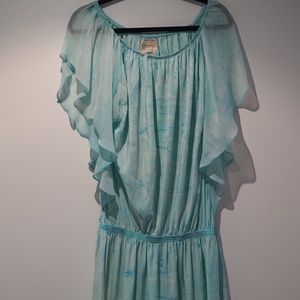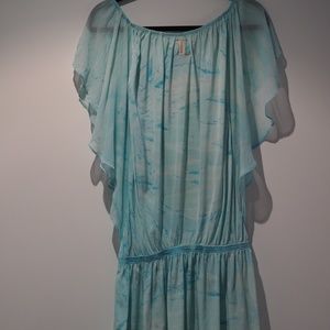 A silk dress with an elastic waistband, beautiful material with a water color mark design, airy dress with a comfortable bohemian fit. Fluttery sleeves can be worn as is or off the shoulder.