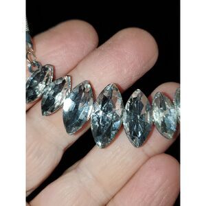 This is an unmarked piece but very elegant. It has a graduated row of rhinestones for the pendant and the chain is a silver tone round snake chain. This piece is about 16" long with a 2" extender. Wear this one to your holiday and New Year's Eve parties.