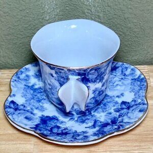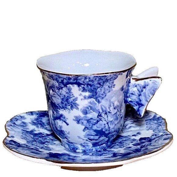 A Special Place Small Tea Cup & Saucer Set Blue & White Floral Design with Butterfly Handle & Gold Trim.