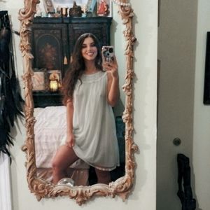 A delicate scoop neckline is trimmed with lace and tiny gathered pleats, giving the whole piece an angelic, airy silhouette. It drapes beautifully, flattering without effort, glowing on the skin like moonlit jade.