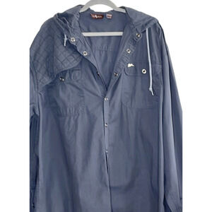 A. TIZIANO LONG SLEEVE MEN'S GRAY OVERSHIRT SIZE 5X. Long sleeve, snap buttons closure, chest pockets ,logo, collared and hooded.Super cool shirt. Pre-owned no flaws. 100%cotton. Measurements: pit to pit 27", length 34".