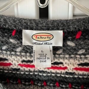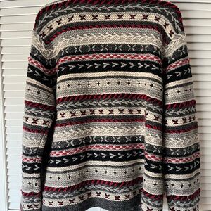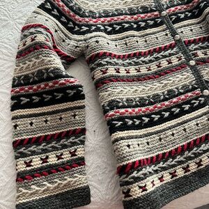 Stay cozy and stylish with this beautifully patterned sweater. Featuring a blend of black, gray, and red, this piece is perfect for any casual outing. Enjoy the comfort and warmth it brings to your wardrobe. The inside is as beautiful as the hand knit outside. Bundle with other items in my closet to save 10%.