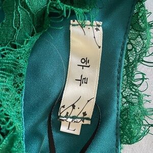 A- Thena design, green midi Lace dress with dragons embellishments. Fully lined with zipper closure and six buttons on the back . New with tag . Pit to pit 17” sleeve 3/4 (15”) waist 14.5” length 39.5 , shoulder to waist 14.5” . Beautiful, elegant for any especial occasion women Large