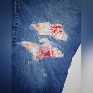 distressed with floral embroidered peek a boo knee patches. super soft denim. Midfit Super Skinny. see pictures. they are part of the description.