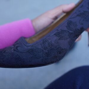 * Details: Almond toe, chunky/block heel, vintage style, embroidered floral pattern.
