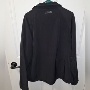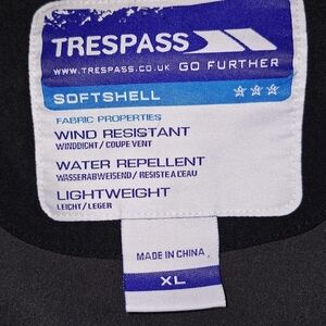 This is a Trespass men's XL softshell cold weather jacket in black. Wind resistant, water repellent, and lightweight. Snow, ski, inclement weather gear. 24.5" PTP, 28" length.
