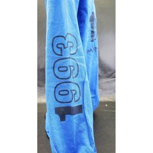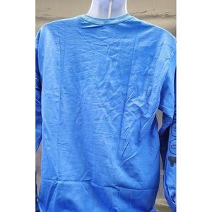 Blue long-sleeve t-shirt featuring large dark blue screenprint on the front and on both sleeves.