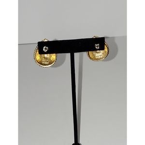 These Trifari post pierced earrings are back in style. Chunky gold tone teardrop shaped with 3 rows of dotted detail. 1.5" long and 1" wide. They do have a more mid century modern look to them even though they were made in the 80's. Great for office wear or out on the town. In very nice pre-owned condition.