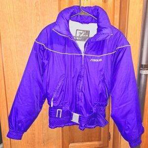 This is a Tyrolia womens snow coat in a size 8. It has an adjustable waist strap with a metal buckle. It's in EUC. Warm, winter, outdoor, cold weather, snow, skiing, gear. It's missing the pull on the front zipper (does not affect the function). 19" PTP, 24" length.
