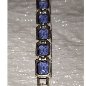This is a very pretty vintage bracelet by Monet. The base is a silver tone and you have rectangular faceted glass stones prong set all along the bracelet. This piece has a fold over clasp and is in very nice pre-owned condition. This is about 7.25" long. Purple is the color of royalty, so here is a piece that can make you feel like a princess.