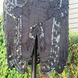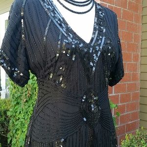 ●Vintage, flapper type dress with all over sequins and beads. Low v-neck in front and a keyhole back. Back zips closed with hook and eye closure on bottom and top. Scalloped hem, back vent, short dolman style sleeves, slight tulip shape skirt.