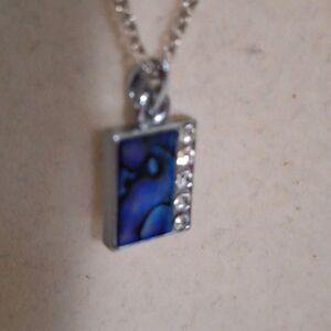This is a lovely blue abalone pendant with a line of clear rhinestones down one side. It is a delicate piece that is elegant and feminine and could be worn to a wedding, or a cocktail party. It is 18" long and in very nice pre-owned condition.