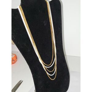 For all it's simplicity, this is a really spectacular necklace. You don't see this combination very often and it has a lot of pizzaz along with being very elegant and timeless. This could be worn by a runway model or granny. The drop to the first layer is 9.5" and there are 4 gold tone layers and two white. It has a spring ring clasp, so probably 80's or before. It is in very nice pre-owned condition.