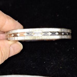 This is a vintage Monet bangle bracelet, It appears to be stainless steel and has a pattern cut through the middle of it. It is scratched and needs a good cleaning on the inside, but the outside is textured and appears to be in nice condition. The diameter on this is 2 5/8" .