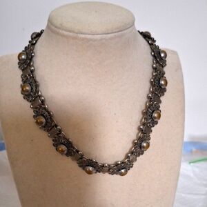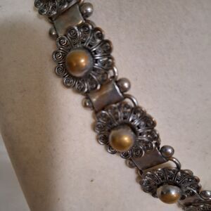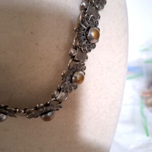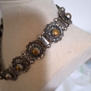 This piece looks a bit worn, but I think it could be upcycled pretty easily and well worth it. Google Lens says this may be a Mexican piece, but there are no markings on it that I can find. It really does need a good cleaning. This is 16" long with a fold over clasp.
