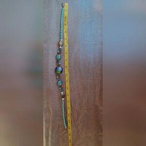 vintage 90s hand strung glass bead lamp work style choker bib collar necklace. blue teal turquoise green aqua amber brown glass beads purple seed beads blue white faux pearl round beads metal charm disc beads lobster claw clasp closure. maker unknown handmade faux crystal cut beads stones plastic painted aqua blue and white iridescent pearls seed bead spacers specks crackle splatter design multi colored glue wear peel old antique estate statement piece
