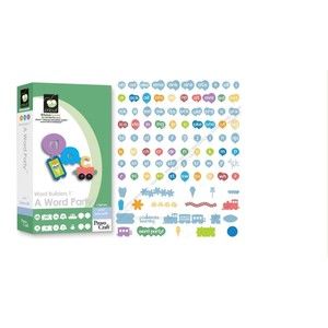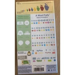 “A Word Party ” cartridge - Cut out letters and sounds to form words; for example br + ight = bright. This cartridge does not contain a font, it does have many word families. The creative features allow you to put your letters in balloons, puzzle pieces, tiles, train flatbeds and flower petals and centers.” Never used , New I don’t know if I linked it or not. Box shows some wear
