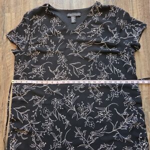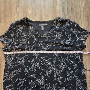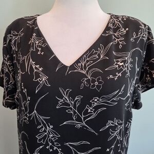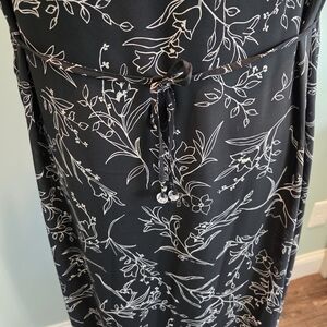 Beautiful black maxi dress from A Wild Thyme featuring an elegant white floral vine print throughout. This flowing dress has a flattering V-neckline, short dolman sleeves, and a relaxed fit perfect for comfort and style. The botanical print gives it a sophisticated, garden-inspired look. Made from 100% polyester. Made in Bangladesh. Machine washable in cold water.