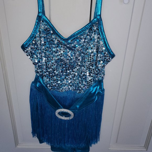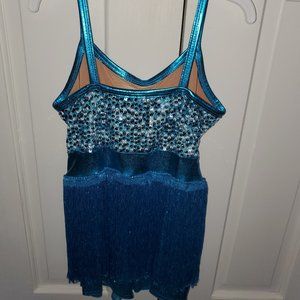 Blue sparkle bodice with fringe skirt. Leotard base underneath