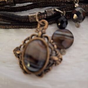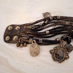 This is a very cool snap on leather bracelet with lots of charms and neat things to look at. It is a metallic gold tone color on the front and it does have some more spaces for more charms. This piece is very steampunk and I really have never seen anything like it. It has two sets of snaps on one side, so it is somewhat adjustable. It is 8" long and in good pre-owned condition.