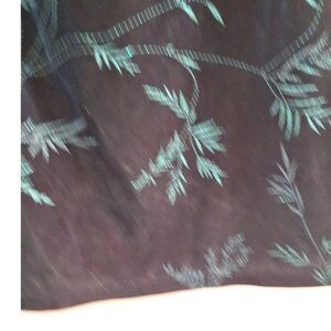 This piece is a dark teal blue with lighter sparkly fern leaves throughout. It is a velvet material with an elastic band at the waistline. All of the tags have been cut out of this piece but it is in nice pre-owned condition. This is a pencil style straight skirt with a 32" waist and 28" from waist to hem.
