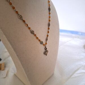 This is a very pretty women's necklace with a pewter rustic looking heart charm pendant and a beaded chain. The beads appear to be an amber color and in between are silver tone stations. This piece has a very feminine appeal, with a casual vibe. The chain is 16" long with a 3" extender. It is in nice pre-owned condition.