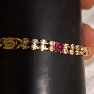 This is a pretty gold tone bracelet with S shaped links and two rows of clear rhinestones surrounding a nice red rhinestone in the middle. This piece is classy, elegant, and very feminine. It is approximately 7" long. This is a piece that is meant to go to the Gala or opera.