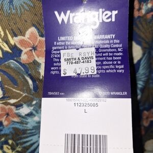 This is a Wrangler men's Hawaiian short sleeve button-down shirt in a size large. It's new with tags with no flaws (see). Summer, floral, Hawaiian, coastal, tropical, beachy shirt.
