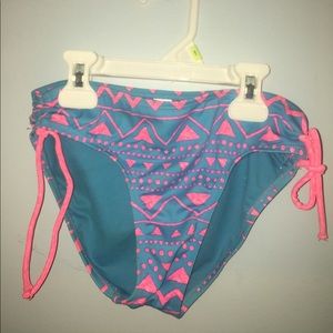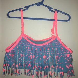 The top has fringes going across the whole top except the back. The back is a really cute pattern!!! The bottoms have ties on the sides and have the same cute pattern that the top has on the back. Ok can tie the sides or just leave it untied:)