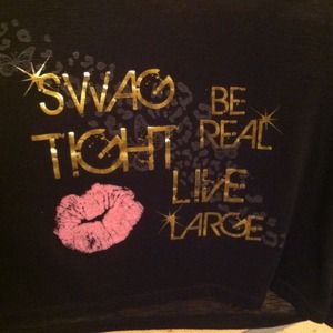 A black crop top, it has gold writing that says swag tight, be real, live large. With a pink lips by it and like cheetah print with butterfly's.