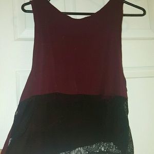 Its a burgandy crop top with black lace on the back. The pictures really dont do it justice. It has a small tear on the back that can easily be sown together.
