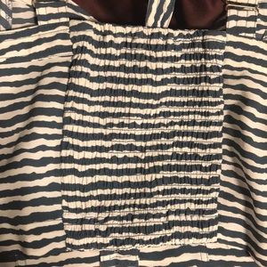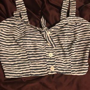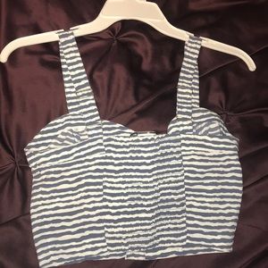 Crop top blue and white stripped with a bow that you can tie your self! With adjustable straps. Its an XS but fits me fine and im a Medium ! I dont think they sell this crop top anymore but not sure!