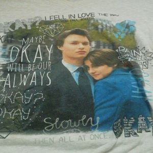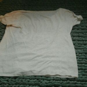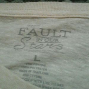 It is a cream color and is a little bit see through. It has a v neck and has the fault in our stars picture with some saying around it.