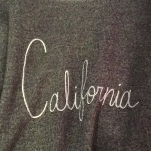 A fuzzy gray sweater, California embroidered on, with light gray collar and sleeve.