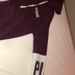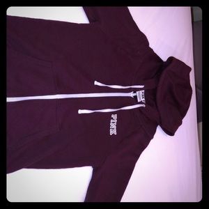 It is a maroon jacket that is very comfy, it has white outline around the word pink which is in maroon on the sleeves!