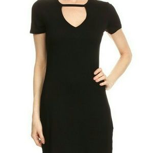 Black and line dress, fitted , short sleeves with front cut out detail, rayon and spandex material.