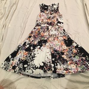 Xs mini dress that has beautiful floral print in color and in black and white the main color is white and in amazing condition super great quality has a button on the back to allow the dress to easily slip on and off the material is super soft and thick