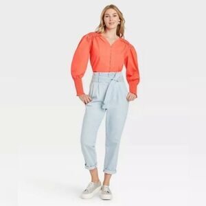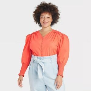 A new day Coral smocked Poplin V neck Long Sleeve Button up Top