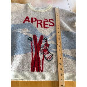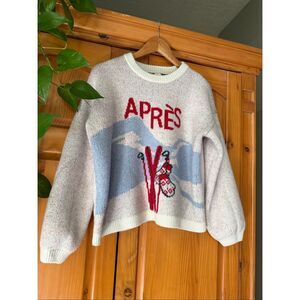 A New Day Holiday Ski Après Crewneck Pullover Cozy Sweater". It features the word "APRÈS" in red lettering and a graphic design of skis and mittens against a snowy mountain backdrop in red and blue. This cozy knit pullover is made from a midweight recycled polyester-acrylic blend.