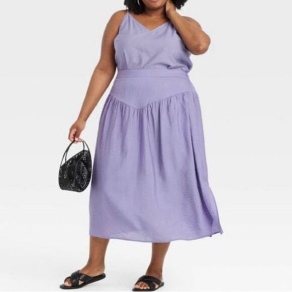 A new day Purple Yoke Front Midi Skirt with slit. Size: xxl. New with tag. Pleated design. Partially lined. One side slit. Pockets. Very lightweight. Stretchy back waistband. Measurements approximately while laying flat: Waist: 19”. Length: 32.5”. Reasonable offers welcome. Smoke free & pet free home.