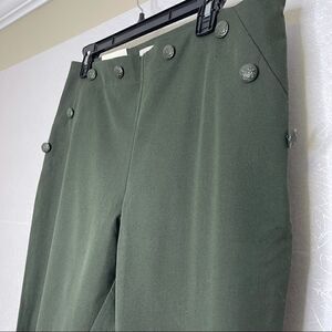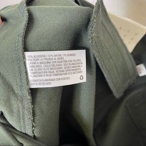 •Features: Army green ankle pants. Flat front pull on style with button detail. Fabric has stretch.