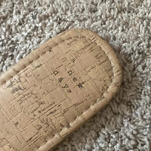 9.5, gently used a new day sandals. Clear straps with cork like foot bed. Perfect sandal for warmer months.