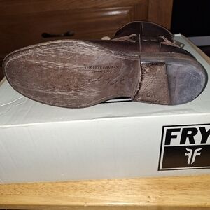 This is a pair of Frye Phillip Harness dark brown ankle boots in a ladies' size 6. They're in like new condition, still in the box. Western, cowgirl, country, leather, line-dancing, boots.