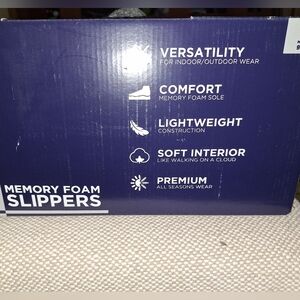 This is a pair of Haggar men's black slippers. They're a size large 9.5-10.5. Features faux fur collar, indoor/outdoor soles, memory foam soles, soft interior, for all seasons.