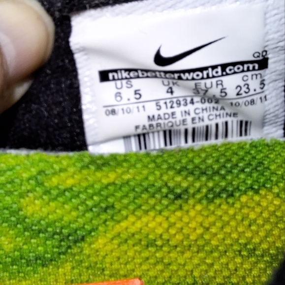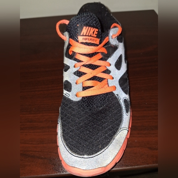 These are a pair of Nike Free Run 2 sneakers in a womens size 6.5. They are black with orange accents ( the trim glows white in the pics). Athletic, athleisure, sports, running, jogging, walking, workout footwear. They have been pre-loved and in great condition.