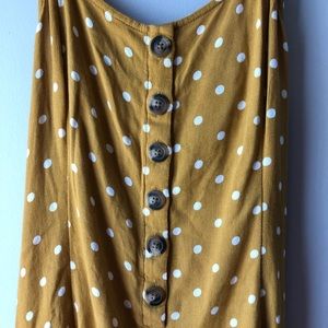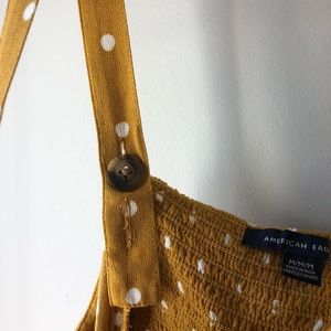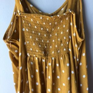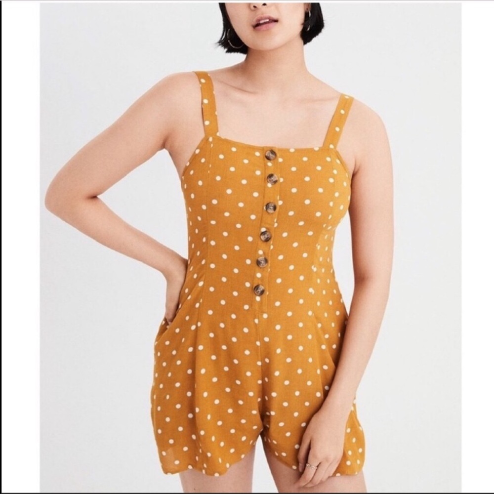 A yellow polka dot romper with pockets! The straps are also adjustable!