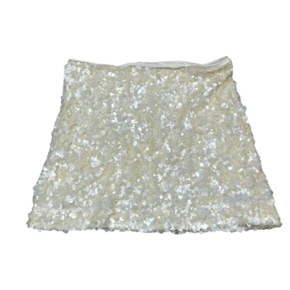 A short white sequin mini skirt. It has an A-line shape and is fully covered in small, reflective sequins, giving it a sparkly, party-ready look.