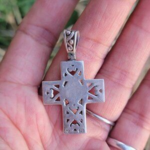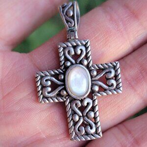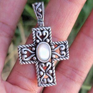 A stunning high-quality solid 925 sterling silver cross featuring an oval center cabachon of genuine shimmery iridescent mother of pearl. The shell is bezel set and sits at the center of the cross. The cross has an open rope border like design with filigree heart swirls with little beads. Bale is sturdy and is attached by a hinge. This is a heavier piece. It is stamped with a maker's hallmark and "925" on the bottom back. Natural, beautiful patina included. May need a cleaning depending on your preferences. Tested with a neodymium magnet and JSP acid, guaranteed sterling.