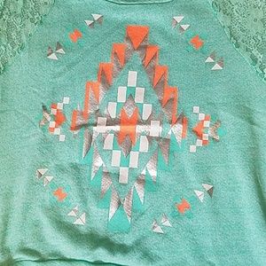 This is a beautiful shirt ! It's in great condition with a cute print and lace on the sleeves. It's a sweatshirt like shirt but it short sleeve. Size L