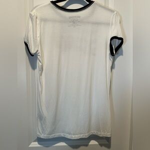 This True Religion t-shirt features a classic ringer style with black trim on a white background. The short sleeves and bold graphic design, including a red heart, make it a standout piece for casual wear.